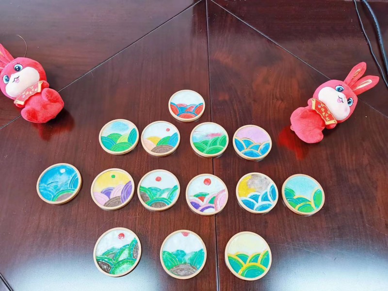 課上,單文靜詳細介紹了掐絲琺瑯彩畫的歷史淵源、發(fā)展歷程和工藝流程,并現(xiàn)場教授創(chuàng)作技巧和色彩搭配,培養(yǎng)大家對琺瑯彩畫藝術(shù)的審美情趣。在場人員聚精會神地傾聽、觀看,相互討論交流。隨后,在老師的指導(dǎo)下,大家用自己的巧手和智慧,按照“掐絲-洗沙-點彩”的步驟,制作出了一個個極具個性、各具韻味的掐絲琺瑯畫杯墊。