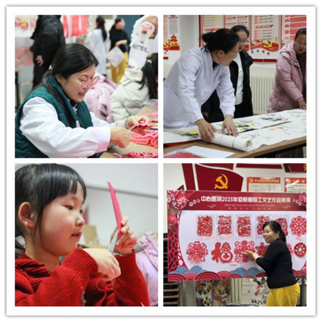 往大廳內(nèi)部走去,便來到了第二個區(qū)域,這里正在進行剪紙、繪畫和書法才藝展示。參與活動的不僅有職工,還有職工家屬及孩子們。他們個個技藝精湛,穩(wěn)穩(wěn)地坐在座位上,手持剪刀、畫筆、毛筆等工具,動作嫻熟,如行云流水般。片刻之間,一幅幅精美的雙魚戲珠、春回大地、彩蝶雙飛等剪紙,一幅幅山水花鳥等畫作,一個個形態(tài)各異的福字便呈現(xiàn)在大家眼前,引得眾人陣陣驚嘆。