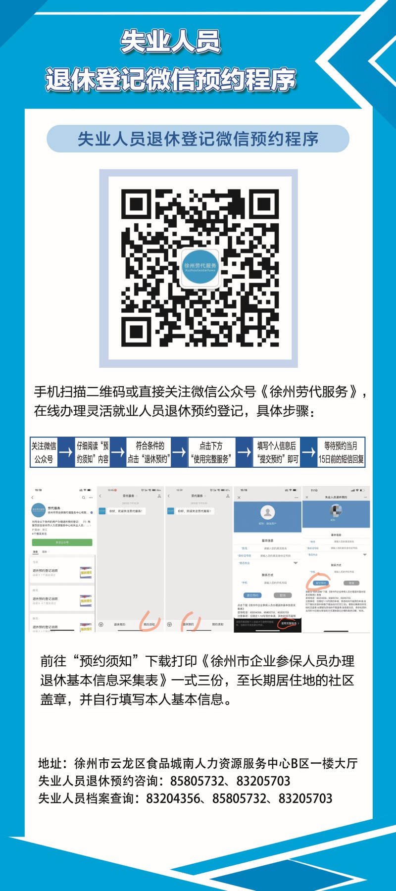 自3月1日起,凡符合以下兩個條件的退休人員,只需在到達法定退休年齡前一個月的10日內(nèi),關(guān)注微信公眾號“勞代服務(wù)”,即可辦理預(yù)約登記:(1)檔案存放在徐州市人力資源服務(wù)中心的失業(yè)人員;(2)未參加過工作,異地戶口以個體繳納徐州市本市養(yǎng)老保險的純個體人員。