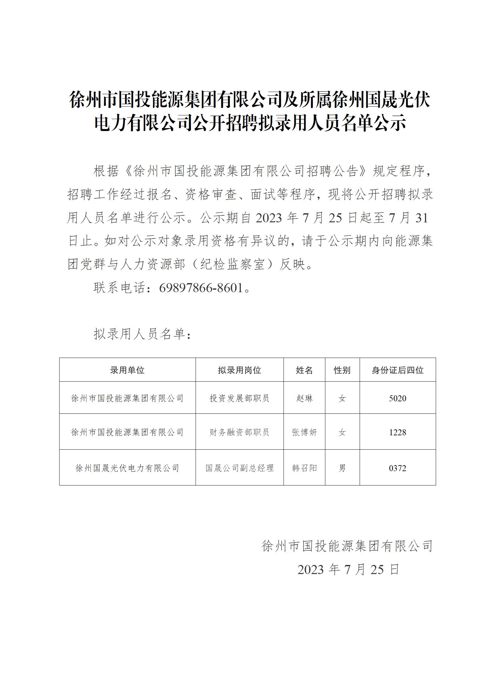徐州市國投能源集團有限公司及所屬徐州國晟光伏電力有限公司公開招聘擬錄用人員名單公示