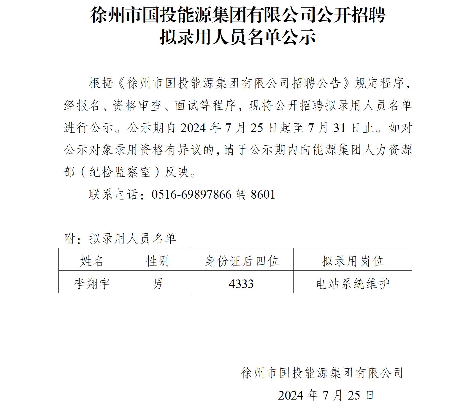 徐州市國投能源集團(tuán)有限公司公開招聘擬錄用人員名單公示