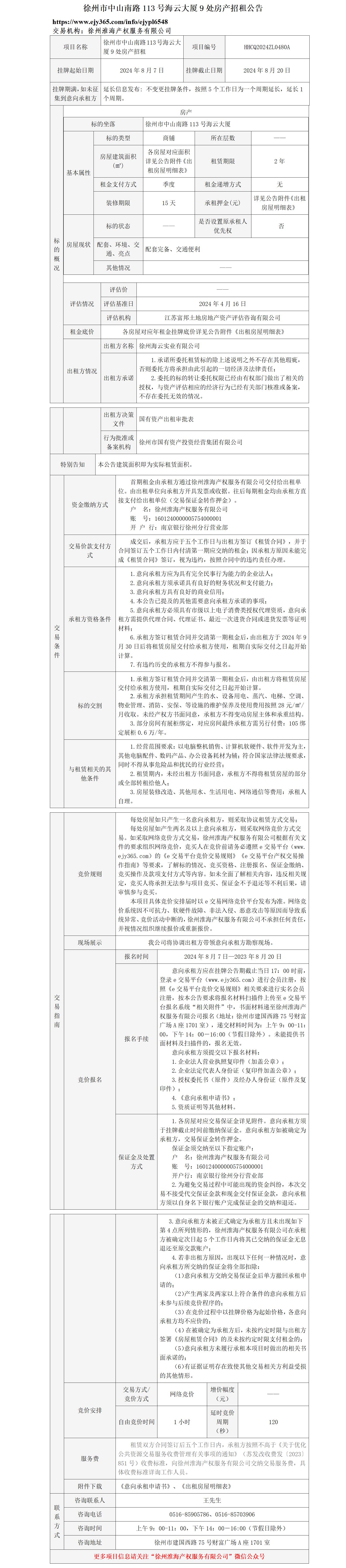 徐州市中山南路113號(hào)海云大廈9處房產(chǎn)招租公告