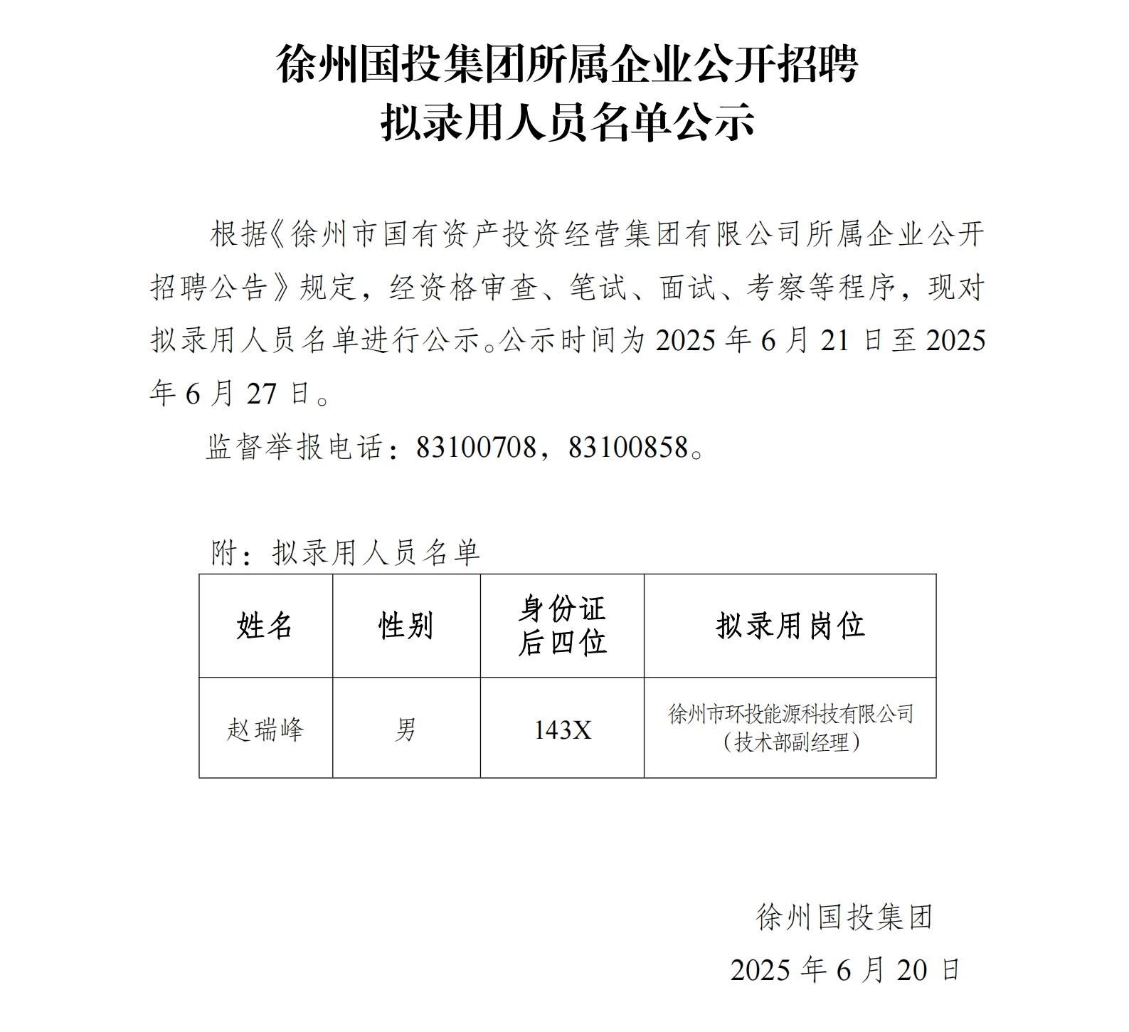 徐州國(guó)投集團(tuán)所屬企業(yè)公開(kāi)招聘擬錄用人員名單公示