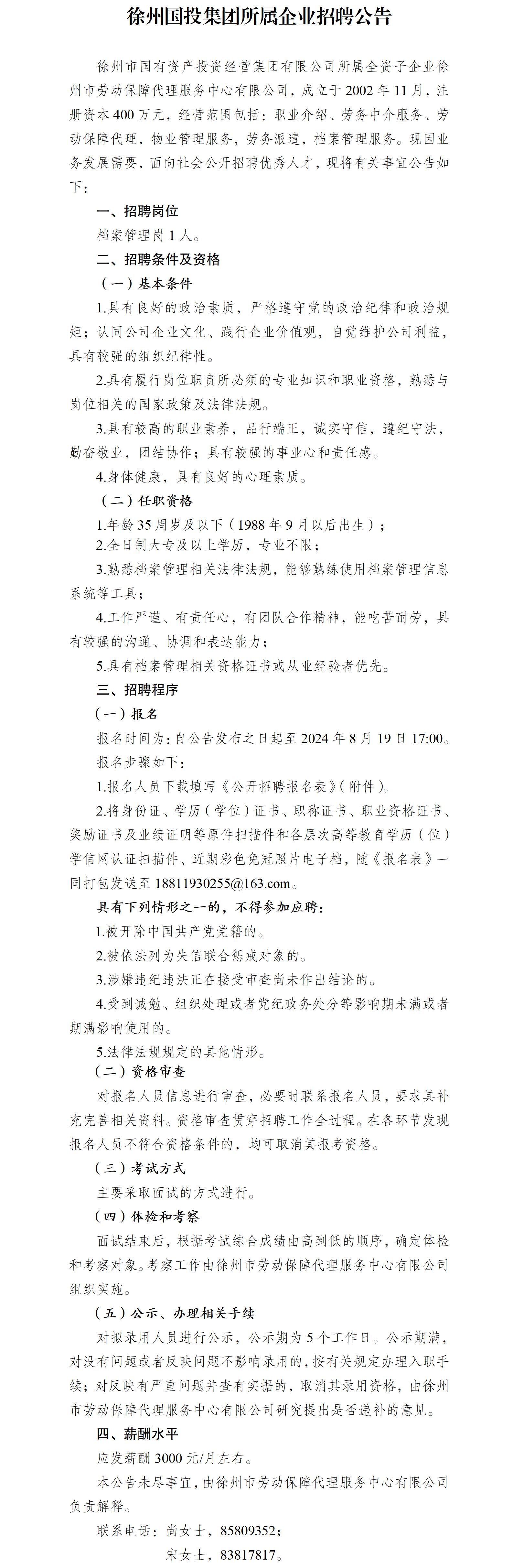 徐州市國有資產投資經營集團有限公司所屬企業(yè)公開招聘公告