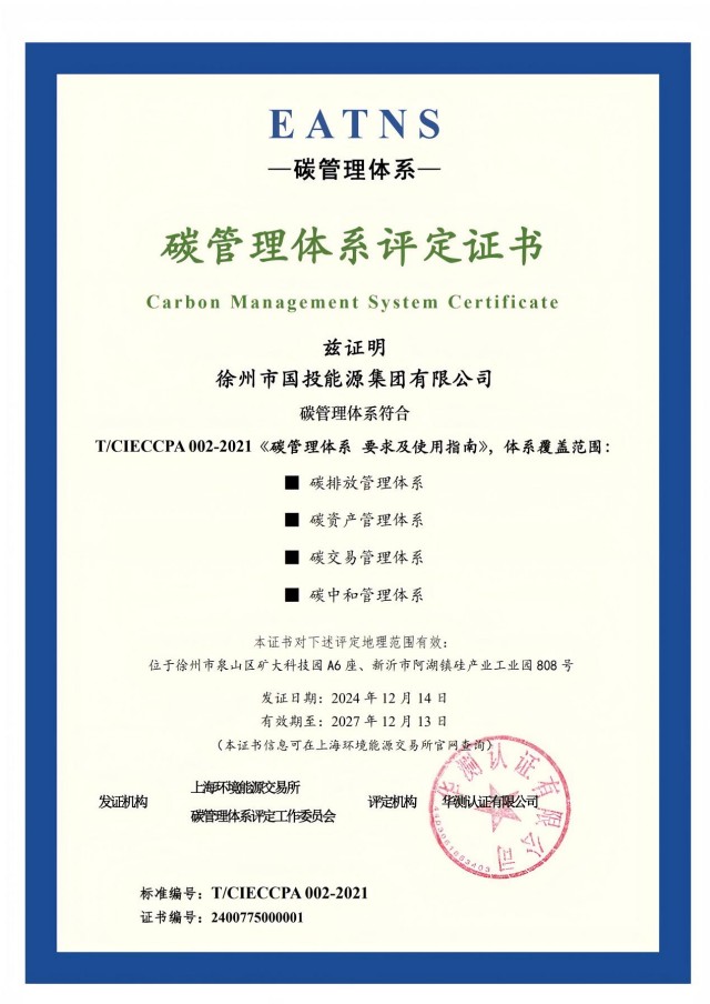 近日,在江蘇彭城碳資產(chǎn)運(yùn)營有限公司的專業(yè)咨詢協(xié)助下,經(jīng)華測(cè)認(rèn)證有限公司專家組的嚴(yán)格評(píng)審,能源集團(tuán)成功通過碳管理體系認(rèn)證審核,并獲得由上海環(huán)境能源交易所頒發(fā)的EATNS碳管理體系證書,成為全市率先獲得該體系認(rèn)證的企業(yè)。同時(shí),碳資信評(píng)價(jià)等級(jí)實(shí)現(xiàn)AA,標(biāo)志著企業(yè)在“雙碳…