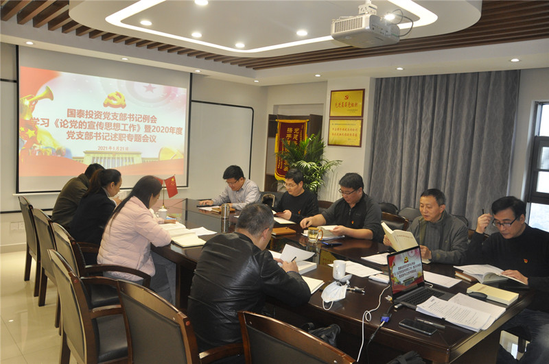 為學(xué)習(xí)貫徹習(xí)近平總書記關(guān)于宣傳思想工作的新思想、新觀點(diǎn)、新論斷,進(jìn)一步落實(shí)黨建工作責(zé)任制,推動(dòng)全面從嚴(yán)治黨向基層延伸。1月21日上午,根據(jù)集團(tuán)公司“雙述雙評(píng)”工作安排,國(guó)泰投資黨總支召開學(xué)習(xí)貫徹《論黨的宣傳思想工作》暨2020年度黨支部書記述職專題會(huì)議。會(huì)議由國(guó)泰投資黨總支書記霍凱主持,黨總支中心組成員、各直屬黨支部書記參加。