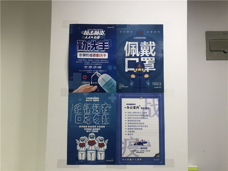 一是營造防疫氛圍。在辦公區(qū)域內(nèi)懸掛“抗擊疫情 從我做起”防疫宣傳條幅,精選“防護建議”等防疫海報張貼在顯著位置,宣傳疫情防控知識,提高職工對疫情防控的重視,嚴防冬季疫情反彈。