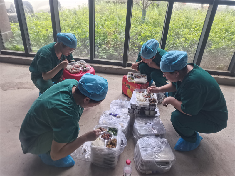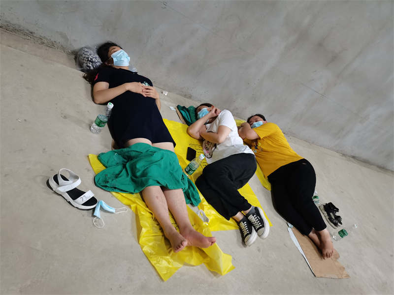 條件的簡陋,為采樣工作增加了難度。在炎熱的環(huán)境下,她們穿著密不透風的防護服,帶著N95口罩、面屏和多層手套,不停地為持續(xù)不斷到來的居民進行采樣。大到90多歲的老人,小到幾個月的嬰兒,一直戰(zhàn)斗到晚上11點多,在8個小時的時間里,憑著她們麻利地操作和熟練的技術(shù),共為4000人完成了核酸采樣。采樣結(jié)束后,有的姐妹累得撐不住了,脫了防護服,顧不得雨天地面的潮濕,直接躺在了生硬的水泥地上。