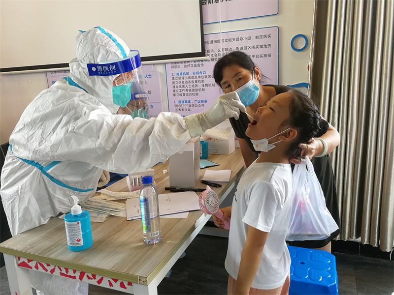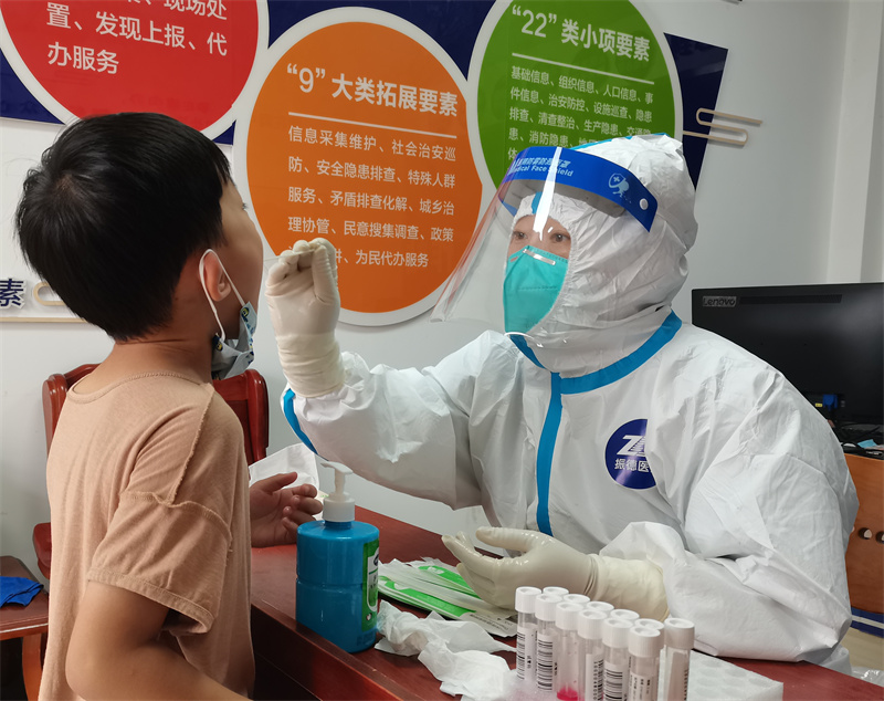 下午4點多,她們乘坐大巴經(jīng)過10個多小時的顛簸后,到達南京江寧區(qū)淳化街道橫嶺社區(qū)后,顧不上休息,立即投入了戰(zhàn)斗。采樣點設在一座毛坯房里,條件非常簡陋,沒有水可洗手,降溫的電器只有兩臺電風扇。洗手間在千米之外的簡易流動廁所,來回需要20分鐘,為了節(jié)省時間,她們都是騎著電動車去方便。