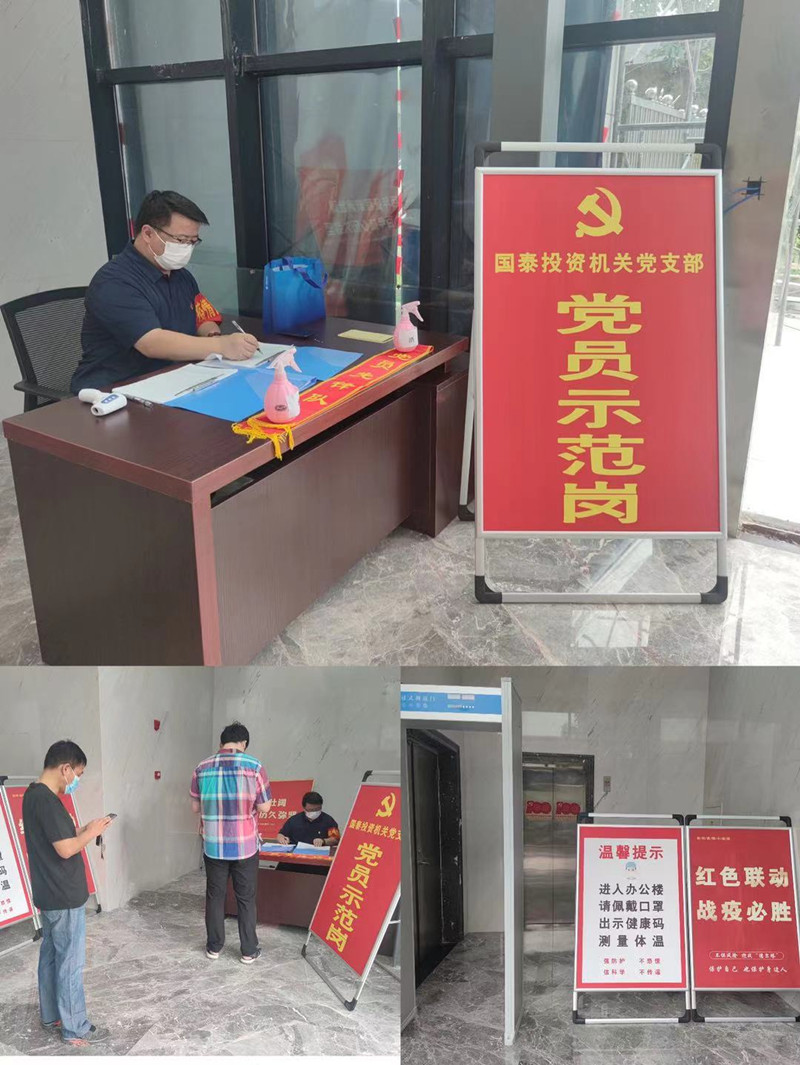 國泰投資公司在此次疫情防控中,獨立設(shè)置員工出入口,并在出入口設(shè)置疫情防控監(jiān)測點,每天早上由“先鋒隊”黨員輪值,督促正確佩戴口罩,查看“兩碼”,測量體溫等,構(gòu)筑群防群治的嚴(yán)密防線。8月9日一早,黨總支書記霍凱同志以身作責(zé),作為先鋒隊第一個正式“上崗”的黨員走上防控監(jiān)測服務(wù)第一線?!?