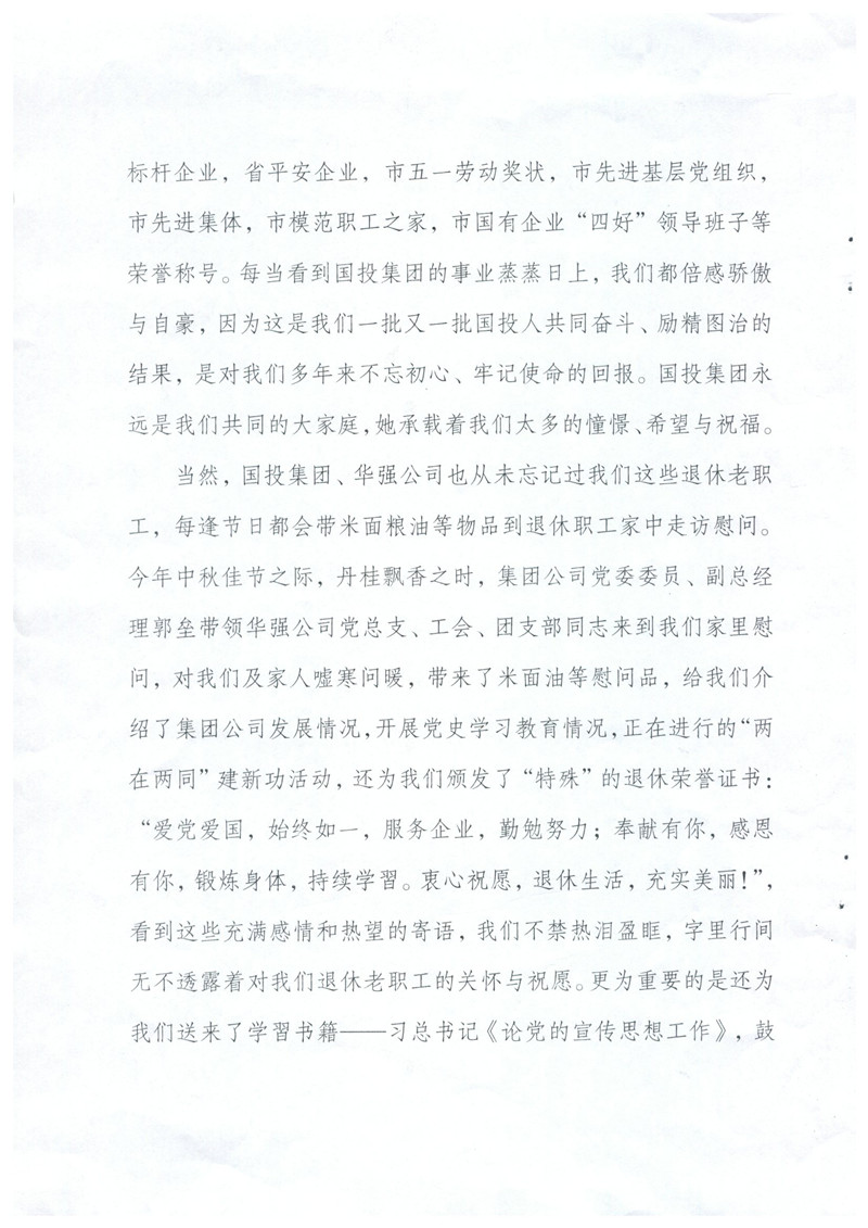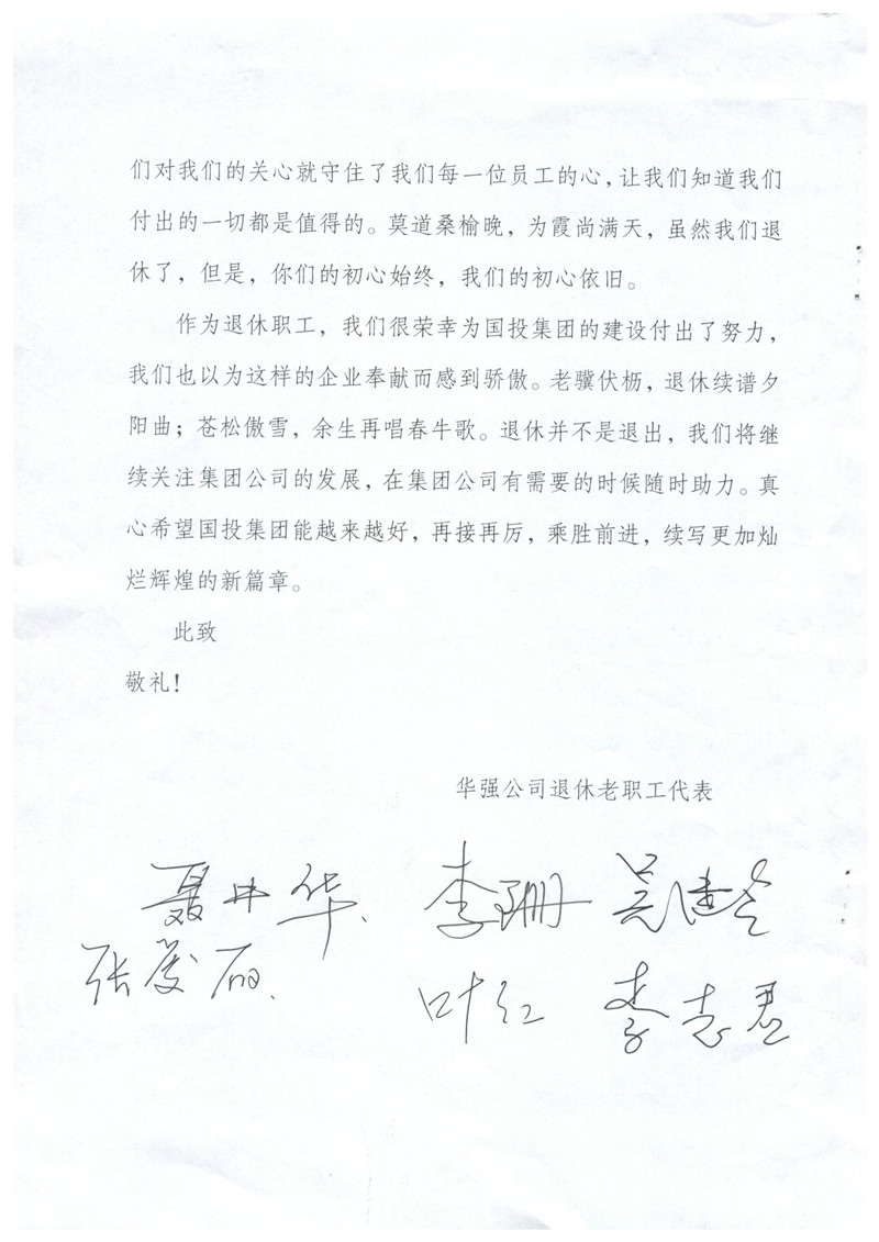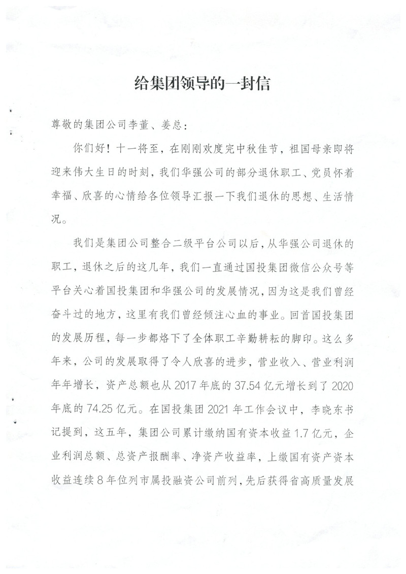 您們好!來信收悉。在中秋佳節(jié)之后,國慶即將來臨之時,收到老同志們的來信,倍感親切,老同志們退休不退出,一直關(guān)心支持國投集團改革發(fā)展情況并積極建言獻策的精神讓我們感動,正是由于像您們一樣的徐州國投老同志們的無私奉獻和精神感召,全集團2000余名在崗職工勤勉履職,愛崗敬業(yè),開創(chuàng)了徐州國投來之不易的發(fā)展成績,我們表示非常感謝,并向您們和國投集團全體退休老同志致以誠摯的問候!