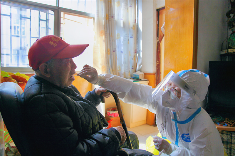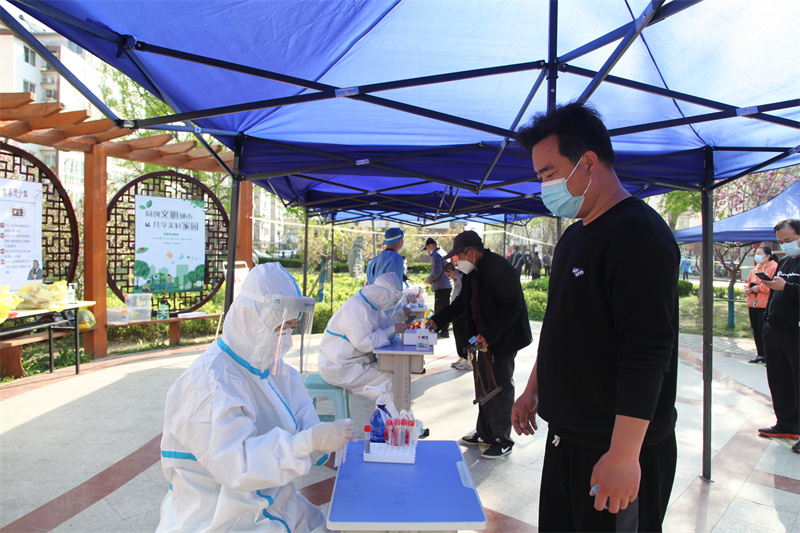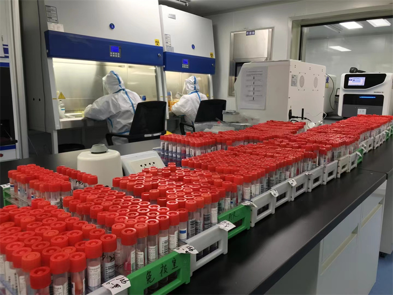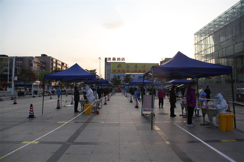 盡銳出戰(zhàn),黨群勠力同心。9日早上5點(diǎn),天色朦朧中,黨員帶領(lǐng)所有工作人員已到達(dá)指定采樣點(diǎn),開(kāi)始做采樣前的準(zhǔn)備工作,6點(diǎn)鐘采樣準(zhǔn)時(shí)開(kāi)始。四月的早上與中午溫差大,采樣人員穿著單薄,早上冷風(fēng)襲來(lái),有的人皮膚上起了蕁麻疹,不敢用手去撓;中午在太陽(yáng)的炙烤下,防護(hù)服下的衣衫早已濕透,只能忍著。即使再辛苦,她們沒(méi)有一聲怨言,有的是戰(zhàn)勝病毒的決心。黨委班子成員下沉一線,奔波于各采樣點(diǎn)進(jìn)行巡查、指導(dǎo),慰問(wèn)大家。黨員同志在采樣中充分發(fā)揮模范帶頭作用,以實(shí)際行動(dòng)帶領(lǐng)大家?jiàn)^力作戰(zhàn)。入戶人員穿著防護(hù)服深入社區(qū),一上午要爬幾十層樓,為行動(dòng)不便的老人采樣。后方陣營(yíng)的檢驗(yàn)科在多人被抽調(diào)外出支援的情況下,面對(duì)堆積如山的標(biāo)本,克服困難,換人不停機(jī),保質(zhì)保量完成標(biāo)本檢測(cè)任務(wù)。