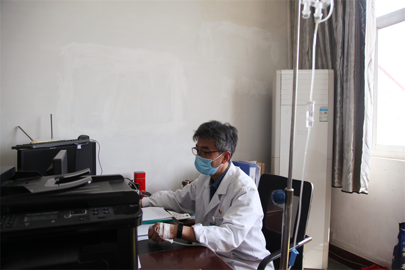 除了辛苦奮斗在采樣現(xiàn)場的人員,還有一位帶給大家感動的人,他就是防控辦副主任趙智勇。防控任務(wù)責(zé)任重大,事無巨細(xì)。自負(fù)責(zé)防控工作以來,他加班加點(diǎn),付出了大量心血,晚上參加上級防控會議是家常便飯,會議開到凌晨一兩點(diǎn)鐘并不少見。身邊的同事評價(jià)他“趙老師是全年無休!”工作的緊張及辛苦,使他得了高血壓,這次全員核酸檢測時,他還在輸液治療中。為了不影響工作,他只能中午在辦公室一邊輸液,一邊聯(lián)絡(luò)協(xié)調(diào)采樣現(xiàn)場工作,并每小時一次對各采樣點(diǎn)報(bào)來的核酸采樣數(shù)據(jù)進(jìn)行匯總上報(bào)。