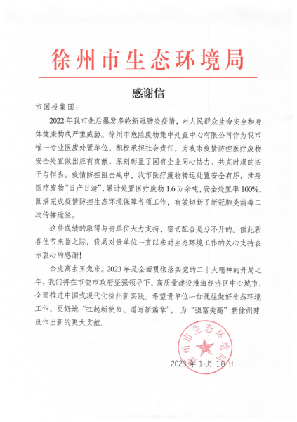 市生態(tài)環(huán)境局對(duì)集團(tuán)公司的感謝信中寫道:“2022年我市先后爆發(fā)多輪新冠肺炎疫情,對(duì)人民群眾生命安全和身體健康構(gòu)成嚴(yán)重威脅。徐州市危險(xiǎn)廢物集中處置中心有限公司作為我市唯一專業(yè)醫(yī)廢處置單位,積極承擔(dān)社會(huì)責(zé)任,為我市疫情防控醫(yī)療廢物安全處置做出應(yīng)有貢獻(xiàn),深刻彰顯了國有企業(yè)同心協(xié)力、共克時(shí)艱的實(shí)干與擔(dān)當(dāng)。疫情防控阻擊戰(zhàn)中,我市醫(yī)療廢物轉(zhuǎn)運(yùn)處置安全有序,涉疫醫(yī)療廢物‘日產(chǎn)日清’,累計(jì)處置醫(yī)療廢物1.6萬余噸,安全處置率100%,圓滿完成疫情防控生態(tài)環(huán)境保障各項(xiàng)工作,有效切斷了新冠肺炎病毒二次傳播途徑?!?