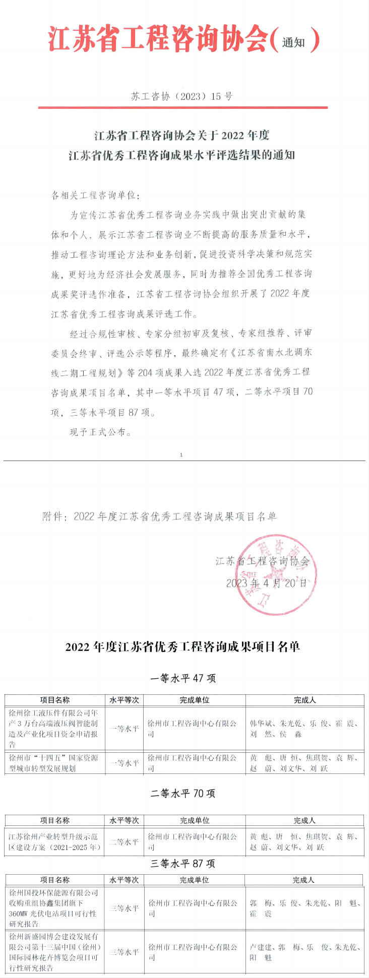 為展示江蘇省工程咨詢業(yè)服務(wù)質(zhì)量和水平,宣傳表彰在江蘇省優(yōu)秀工程咨詢業(yè)務(wù)實(shí)踐中做出突出貢獻(xiàn)的集體和個(gè)人,近日,江蘇省工程咨詢協(xié)會(huì)組織開(kāi)展了2022年度江蘇省優(yōu)秀工程咨詢成果水平評(píng)選工作。集團(tuán)公司所屬工程咨詢中心共有5項(xiàng)咨詢成果獲獎(jiǎng),其中一等水平2項(xiàng),二等水平1項(xiàng),三等水平2項(xiàng)。