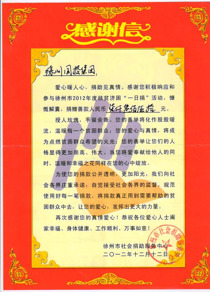 為認(rèn)真貫徹市委辦公室、市政府辦公室《關(guān)于開展扶貧濟(jì)困“一日捐”活動(dòng)的通知》(徐委辦﹝2012﹞105號(hào))精神,集團(tuán)公司于11月上旬組織開展了扶貧濟(jì)困“一日捐”工作。截至目前,集團(tuán)公司本部及所屬企業(yè)共捐款17700元。其中:集團(tuán)公司本部捐款7350元,國(guó)泰公司捐款2650元,華強(qiáng)公司捐款520元,華安公司捐款1200元,金龍成功物業(yè)公司捐款750元,科創(chuàng)軟件園公司捐款780元,彭富公司捐款1430元,海鷗集團(tuán)捐款3020元。
