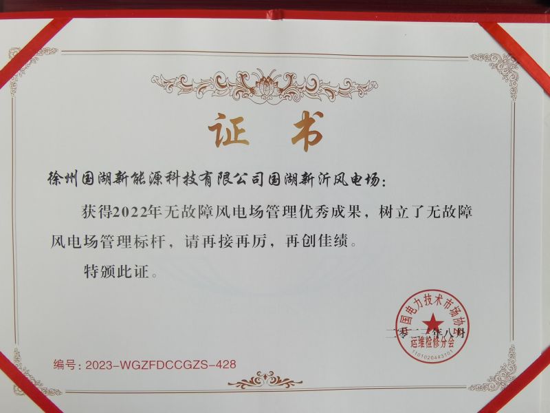 8月24日,徐州國湖新能源科技有限公司所屬國湖新沂風(fēng)電場榮獲中國電力技術(shù)市場協(xié)會頒發(fā)的“2022年無故障風(fēng)電場管理優(yōu)秀成果”獎項。