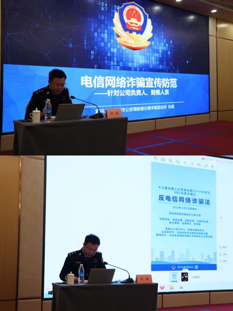 國泰投資公司以“無詐企業(yè)”創(chuàng)建活動為牽引,邀請徐州市公安局鼓樓分局豐財派出所杜所長擔任主講人,開展了一期“電信網(wǎng)絡(luò)詐騙防范宣傳”專題培訓。杜所長以近期頻發(fā)的電信網(wǎng)絡(luò)詐騙真實案件為例,為員工深入剖析電信詐騙的基本類型、話術(shù)特點、基本流程以及防范措施,用“以案釋法”的方式講解了冒充客服詐騙、AI科技詐騙、刷單詐騙、公檢法詐騙等常見手段,從不同角度為員工講授防騙知識,同時也向員工普及了《網(wǎng)絡(luò)安全法》《反電信詐騙法》《個人信息保護法》等相關(guān)的法律法規(guī)知識。