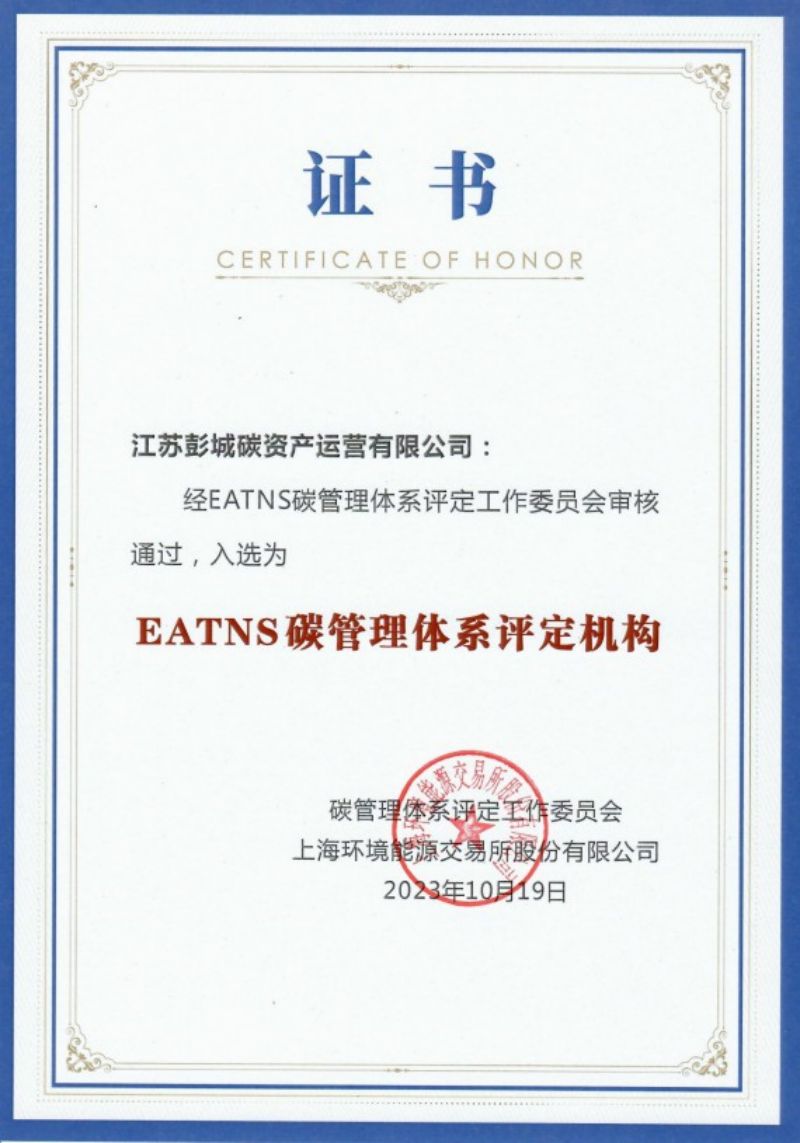今年10月,江蘇彭城碳資產(chǎn)運(yùn)營(yíng)有限公司經(jīng)EATNS碳管理體系評(píng)定工作委員會(huì)審核通過(guò),入選EATNS碳管理體系評(píng)定機(jī)構(gòu),這是全國(guó)能開(kāi)展碳資信評(píng)價(jià)的九家團(tuán)隊(duì)之一。