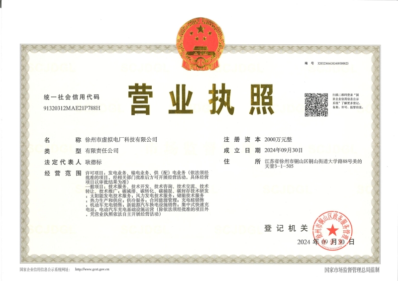 9月30日,徐州市虛擬電廠科技有限公司取得營業(yè)執(zhí)照,正式注冊設(shè)立,為中華人民共和國75周年華誕獻上賀禮。虛擬電廠項目由央企華潤電力旗下全資三級子公司華潤智慧能源公司和徐州國投集團權(quán)屬企業(yè)彭城投資公司合作建設(shè),旨在加快培育發(fā)展綠色低碳新質(zhì)生產(chǎn)力,落實《徐州市新型能源體系中長期發(fā)展規(guī)劃(2023-2030年)》,推動新型能源體系高質(zhì)量發(fā)展。
