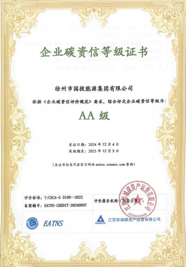 近日,在江蘇彭城碳資產(chǎn)運營有限公司的專業(yè)咨詢協(xié)助下,經(jīng)華測認證有限公司專家組的嚴格評審,能源集團成功通過碳管理體系認證審核,并獲得由上海環(huán)境能源交易所頒發(fā)的EATNS碳管理體系證書,成為全市率先獲得該體系認證的企業(yè)。同時,碳資信評價等級實現(xiàn)AA,標(biāo)志著企業(yè)在“雙碳”管理工作方面取得了重大突破。