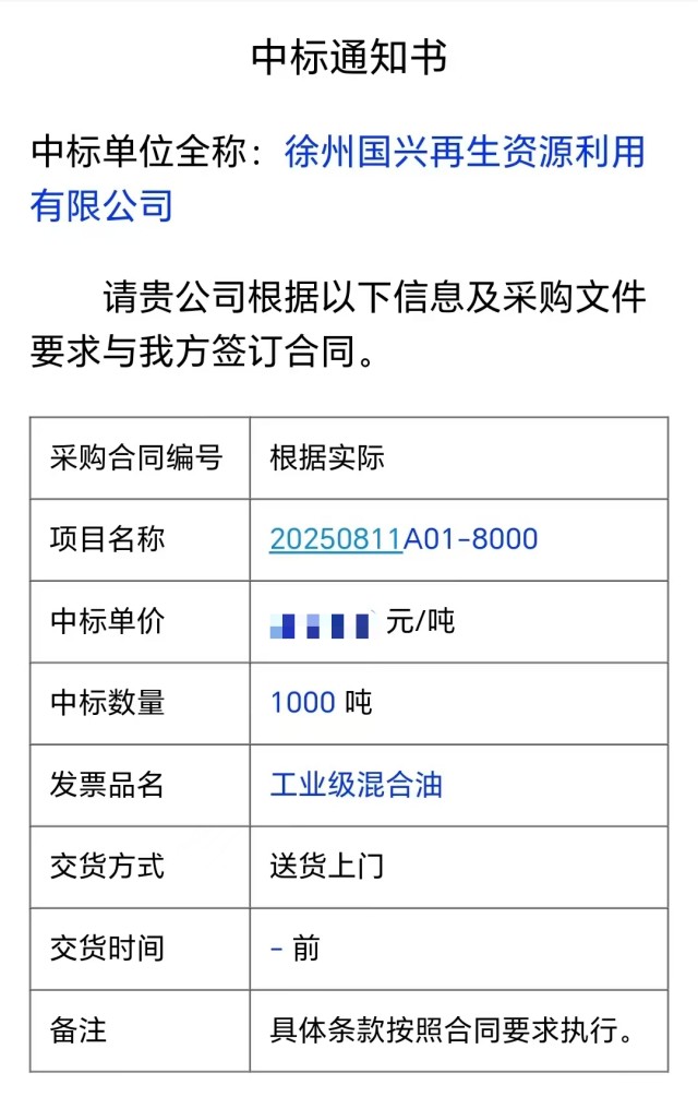 8月12日,徐州國興再生資源利用有限公司迎來重大突破——成功中標連云港嘉澳新能源有限公司1000噸工業(yè)級混合油(UCO)采購項目(中標編號:20250811A01-8000)。這是國興公司首次實現(xiàn)千噸級工業(yè)級混合油貿(mào)易,標志著集團公司在生物質(zhì)能源領域的市場開辟新道路,也為企業(yè)建立零碳工廠邁出堅實的一步。