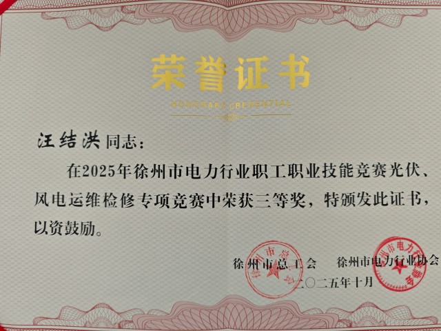 近日,由徐州市總工會和徐州市電力行業(yè)協(xié)會主辦、華潤電力徐州公司承辦的2025年徐州市電力行業(yè)職工職業(yè)技能競賽光伏、風電運維檢修專項競賽圓滿落幕,國爍公司派員參加并喜獲三等獎。