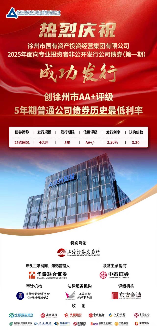 2025年10月31日,徐州國投集團(tuán)成功發(fā)行面向?qū)I(yè)投資者非公開發(fā)行公司債券(第一期),發(fā)行利率2.30%,創(chuàng)下徐州市AA+評級5年期普通公司債券歷史最低發(fā)行利率紀(jì)錄。