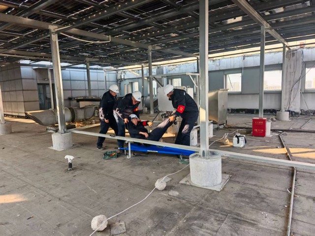 演練緊扣“安全第一、預(yù)防為主、綜合治理”方針,模擬電站運(yùn)維人員在屋頂進(jìn)行逆變器檢修時(shí),不慎觸及裸露電纜導(dǎo)致觸電昏迷的緊急場景。活動(dòng)現(xiàn)場,隨著總指揮一聲令下,演練正式拉開序幕。參演人員迅速進(jìn)入角色,從事故發(fā)現(xiàn)、電源切斷、脫離電源、現(xiàn)場救護(hù)到啟動(dòng)心肺復(fù)蘇、撥打急救電話,整個(gè)流程緊張有序、銜接緊密。現(xiàn)場救援人員反應(yīng)迅速、操作規(guī)范,充分展現(xiàn)了扎實(shí)的安全技能和高效的團(tuán)隊(duì)協(xié)作能力。