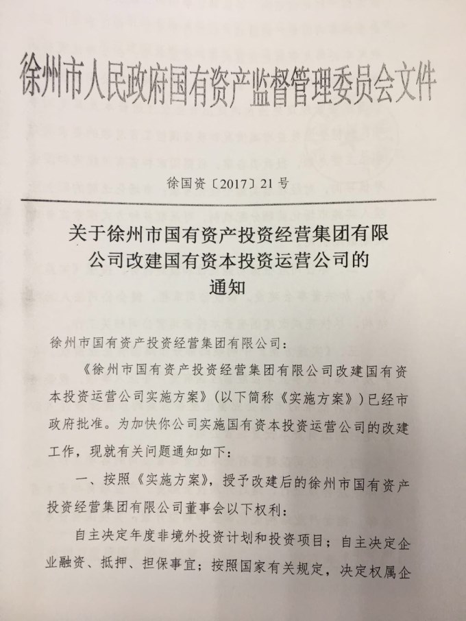 二、1月24日,市國資委印發(fā)《關于徐州市國有資產(chǎn)投資經(jīng)營集團有限公司改建國有資本投資運營公司的通知》,集團公司被確定為徐州首家國有資本投資運營公司試點企業(yè)。