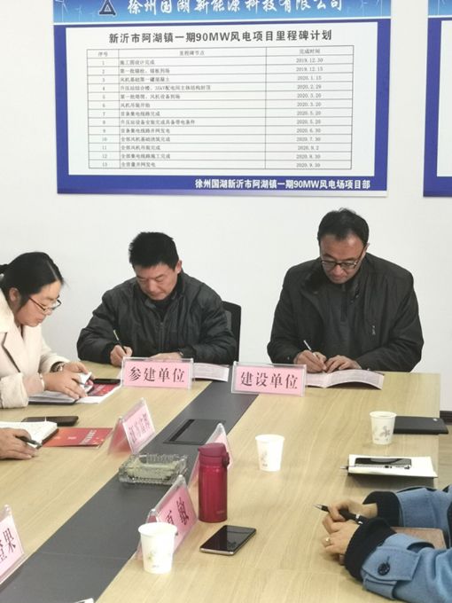 為進(jìn)一步嚴(yán)格貫徹落實(shí)集團(tuán)公司黨委工程建設(shè)廉潔從業(yè)決策部署,有效從源頭預(yù)防各類違規(guī)違紀(jì)違法行為發(fā)生,為新沂市阿湖鎮(zhèn)一期90MW風(fēng)電項(xiàng)目工程建設(shè)、項(xiàng)目管理營造良好的廉潔環(huán)境。12月3日下午,國投環(huán)能公司全資企業(yè)徐州國湖新能源科技有限公司(以下簡稱“國湖公司”)在新沂市阿湖鎮(zhèn)便民服務(wù)中心舉行了《工程建設(shè)廉潔從業(yè)責(zé)任書》簽字儀式。國投環(huán)能公司黨總支書記、國湖公司董事長孫雷,國投環(huán)能公司紀(jì)檢聯(lián)系人,國湖公司風(fēng)電項(xiàng)目部代表及工程總承包、項(xiàng)目監(jiān)理、跟蹤審計(jì)等參建單位代表參加了儀式,簽字儀式由國投環(huán)能公司總經(jīng)理助理、國湖公司總經(jīng)理余躍主持。集團(tuán)公司紀(jì)檢監(jiān)察室副主任夏敏到場見證簽訂儀式。