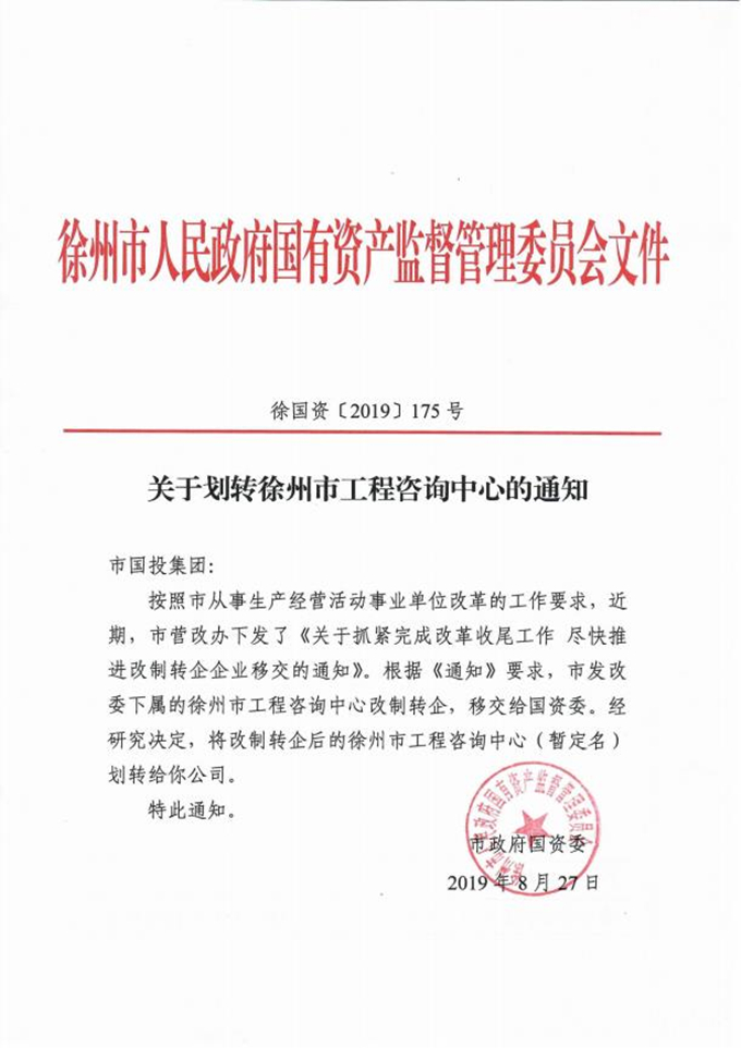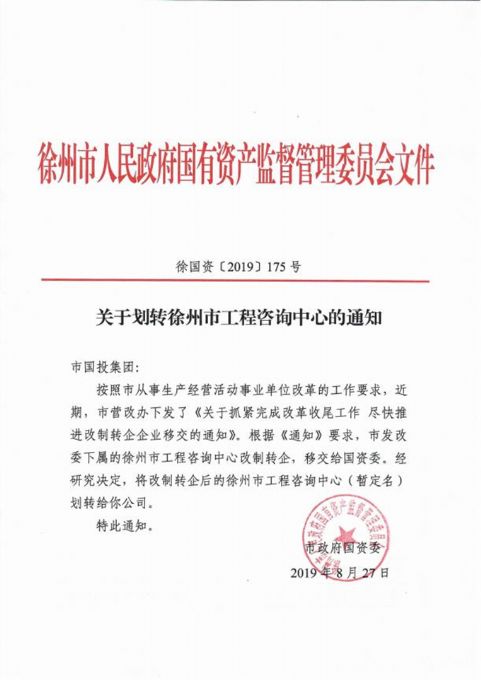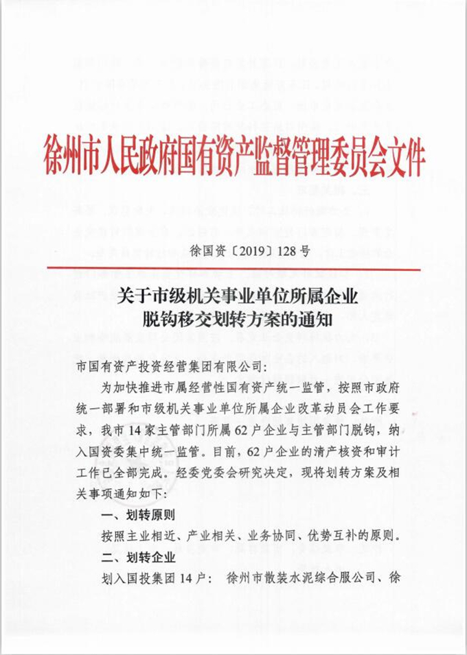 10.7月4日,市國資委印發(fā)《關(guān)于市級機關(guān)事業(yè)單位所屬企業(yè)脫鉤移交劃轉(zhuǎn)方案的通知》(徐國資〔2019〕128號),決定將徐州市商辦工業(yè)公司等14家企業(yè)劃入國投集團。8月27日,市國資委印發(fā)《關(guān)于劃轉(zhuǎn)徐州市工程咨詢中心的通知》(徐國資〔2019〕175號),決定將改制轉(zhuǎn)企后的徐州市工程咨詢中心(暫定名)劃轉(zhuǎn)給國投集團。