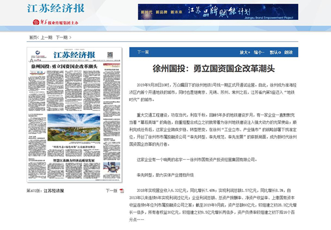 15.10月17日,《徐州國投:勇立國資國企改革潮頭》登上《江蘇經(jīng)濟報》,并被人民日報網(wǎng)、今日頭條、新浪網(wǎng)等20余家媒體轉(zhuǎn)載,有力提升了集團公司的影響力和知名度。