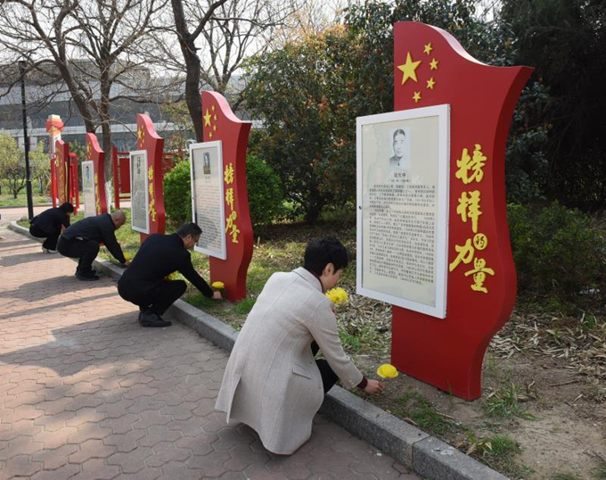 4月3日上午9時許,全體參與人員在會議室集中,利用彩紙、鐵絲等簡單的材料親自動手制作絹花,只見大家有的折紙、有的剪裁,寧靜而肅穆的制作,表達(dá)著我們對英雄發(fā)自肺腑的哀思和敬意。制作完成后,大家來到黨建文化園《榜樣的力量》專題區(qū),手捧花束依次排開,向革命先輩深深鞠躬并默哀,將親手制作的絹花整齊擺放在展板前。隨后,機關(guān)支部黨員代表就榜樣專題事跡向大家做了分享交流,感悟他們?yōu)榱斯伯a(chǎn)主義信仰英勇獻(xiàn)身的光輝事跡。最后,大家來到黨建園的宣誓區(qū),舉起右手,莊嚴(yán)宣誓,重溫入黨誓詞、重悟入黨初心?;顒咏Y(jié)束后,大家紛紛駐足在園區(qū)的不同專欄,認(rèn)真瀏覽、細(xì)細(xì)品讀,久久不舍離去。