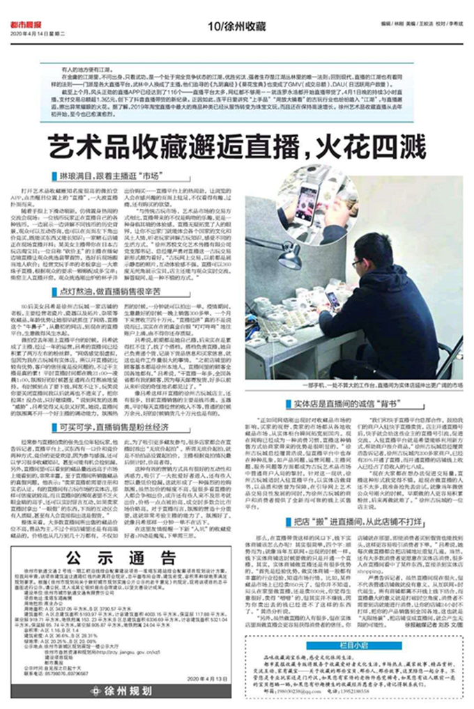華強(qiáng)資產(chǎn)公司所屬的蘇悅文化公司直播基地自推廣以來,在徐州文化圈內(nèi)引起了強(qiáng)烈共鳴,都市晨報(bào)文化專欄記者知悉后,主動(dòng)聯(lián)系蘇悅公司進(jìn)行了采訪,并與2020年4月14日(周二),對(duì)此進(jìn)行了整版報(bào)道。